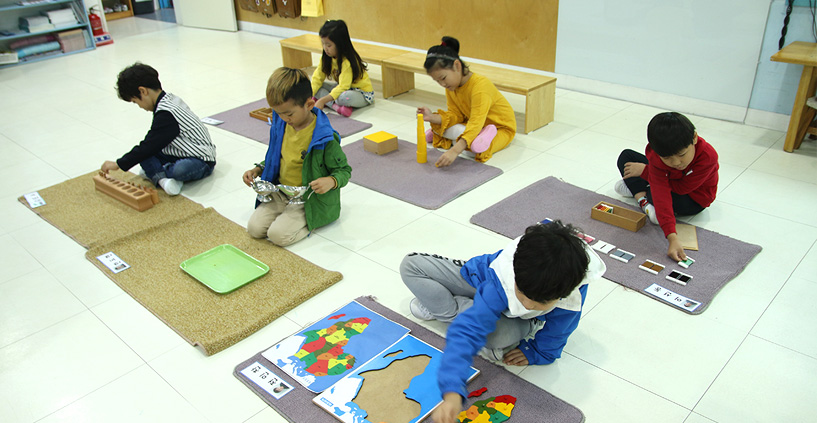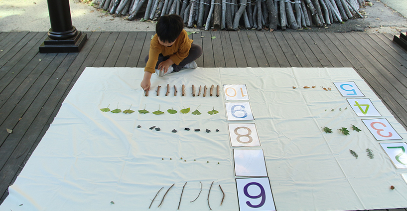 수니교정에서 자연물을 이용한 수업을통해 몬테소리 수영역, 감각영역 등을 반복학습 한다.