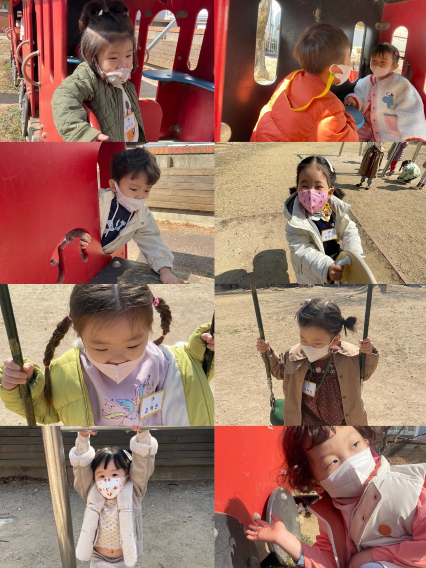 바깥놀이를 나간 수수반 친구들~! 나가서 하늘도 보고 오늘 날씨가 어떤지 느껴본답니다 날씨에 대해서 얘기를 나눈 다음 수수반이 가장 좋아하는 기차놀이터로 슝슝 기차타세요~하면서 기차놀이도 하고 그네 철봉놀이를 질서를 꼭꼭 지키며 놀이하는 아이들이에요♡
