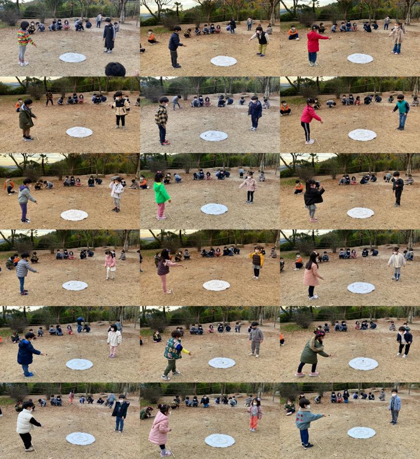 하나! 둘! 셋! 동시에 자연물을 던져 누가누가 더 과녁의 중앙에 자연물을 맞추는지 대결을 해보았지요.