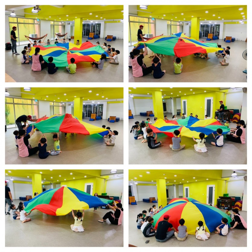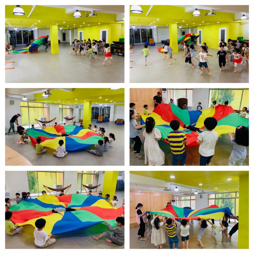 색색의 파라슈트를 잡고 아이들과 자유롭게 흔들고 당기며