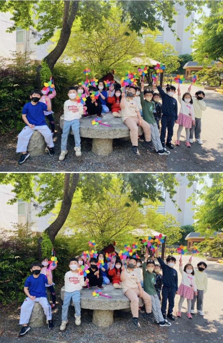 아이들이 완성된 바람개비를 들고 이리저리 뛰어다니며 즐거워하는 모습에 흐뭇한 미소를 지을 수 밖에 없었어요