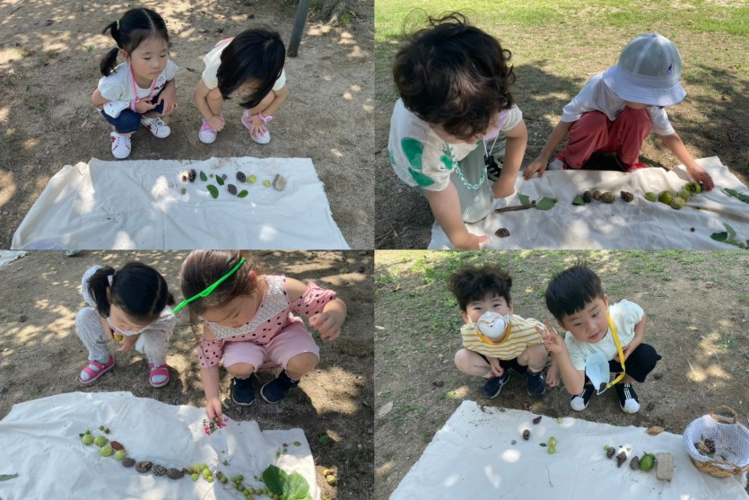 숲에서 자연물을 찾아 무게를 비교하며 나열해보았어요~!