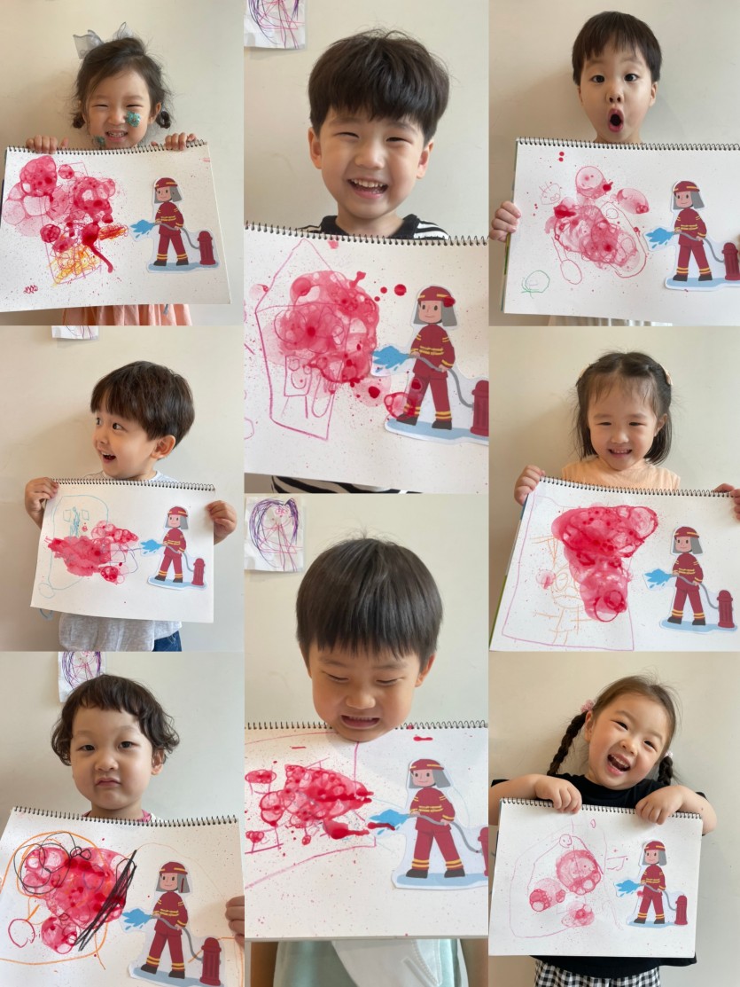 색연필로 집을 그리고 수수반 친구들이 거품을 불어 빨간 거품으로 불을 표현해보았답니다