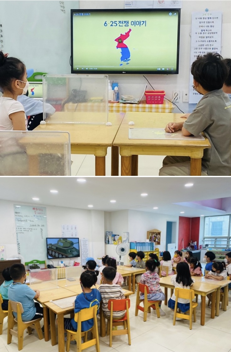 영상을 함께 시청하며 아이들이 “전쟁터에 나가는 모습 등을 보며 “슬프다..”,”속상해요” 라는 감정에 공감하며 뜻깊은 시간을 보냈답니다.