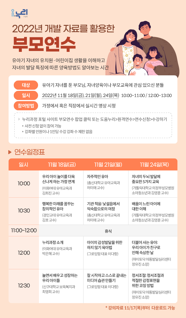 2022년 누리과정 포털 부모연수 안내 페이지 정보 작성자 수니유치원 작성일22-11-07 14:57 조회2,128회 본문 . 목록 답변 이전글실내 마스크 착용 의무 조정에 따른 학교 적용사항♥ 23.01.30 다음글학교 방역지침 일부 개정내용 안내(22.4.18. 기준) 22.04.15